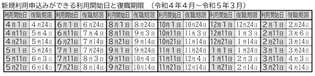 - 復職期限の日付は、土日も含めて日付が設定されていますので、復職期限ぎりぎりまで慣らし保育を実施したいという方は曜日の確認をしておきましょう。