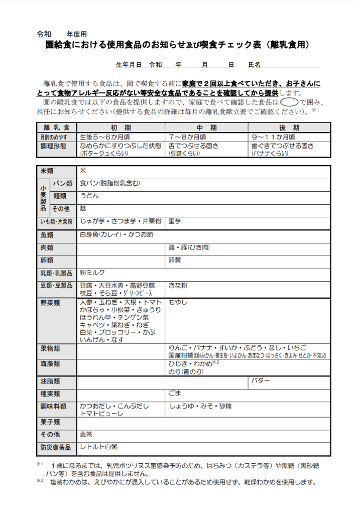 保育園で初めて口にするものがないように、「食材確認表」の記入を求められる場合があります。