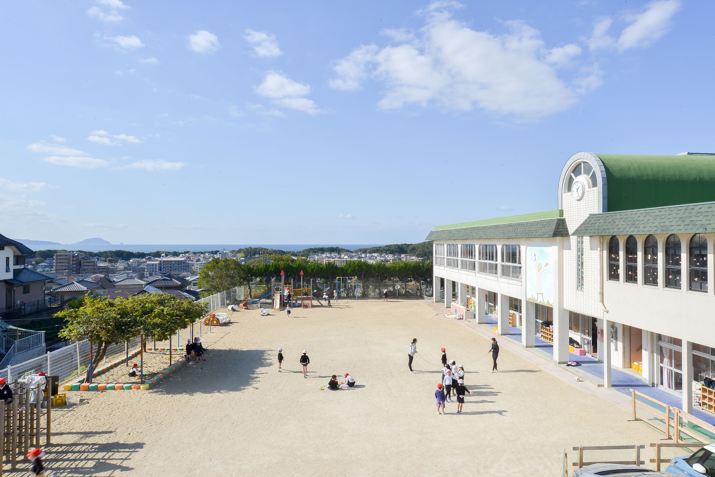 園庭や屋上の芝生スペースはもちろん、近隣の公園で遊んだり、消防署や多々良川、名島神社へ園外散歩に行くこともあります。ホームページもご覧頂けると幸いです!(https://www.shinai-nursery-school.net/)