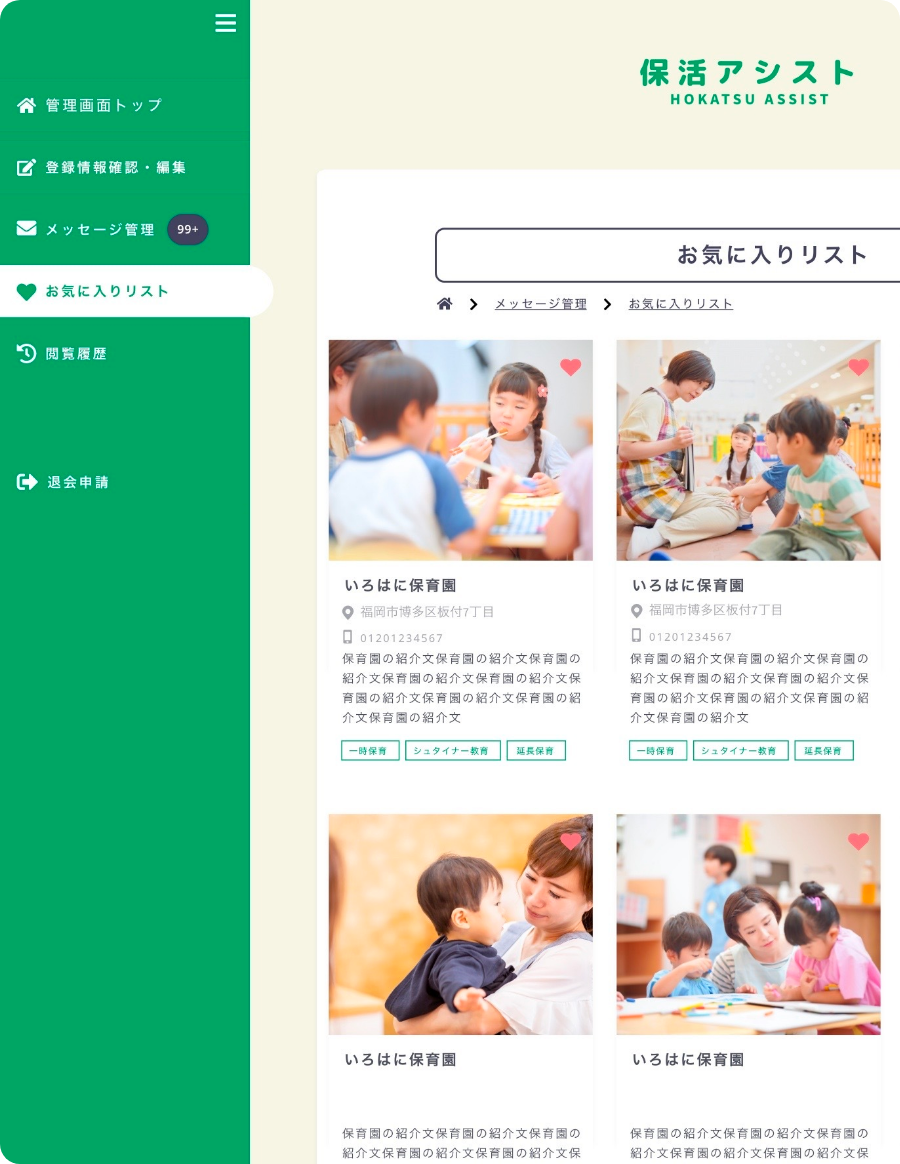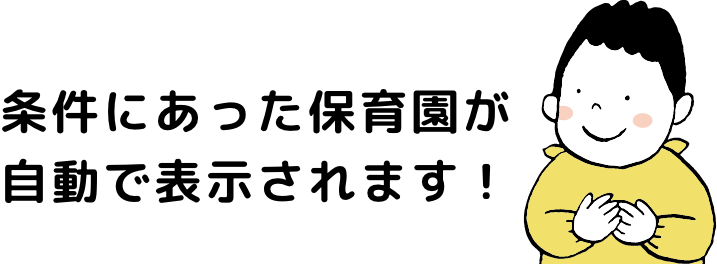 第一希望・第二希望のエリアと、「送迎駐車場あり」や「19:00以降開園」などのこだわりを登録するだけで条件にあうおすすめの保育園が管理画面上に表示されます!